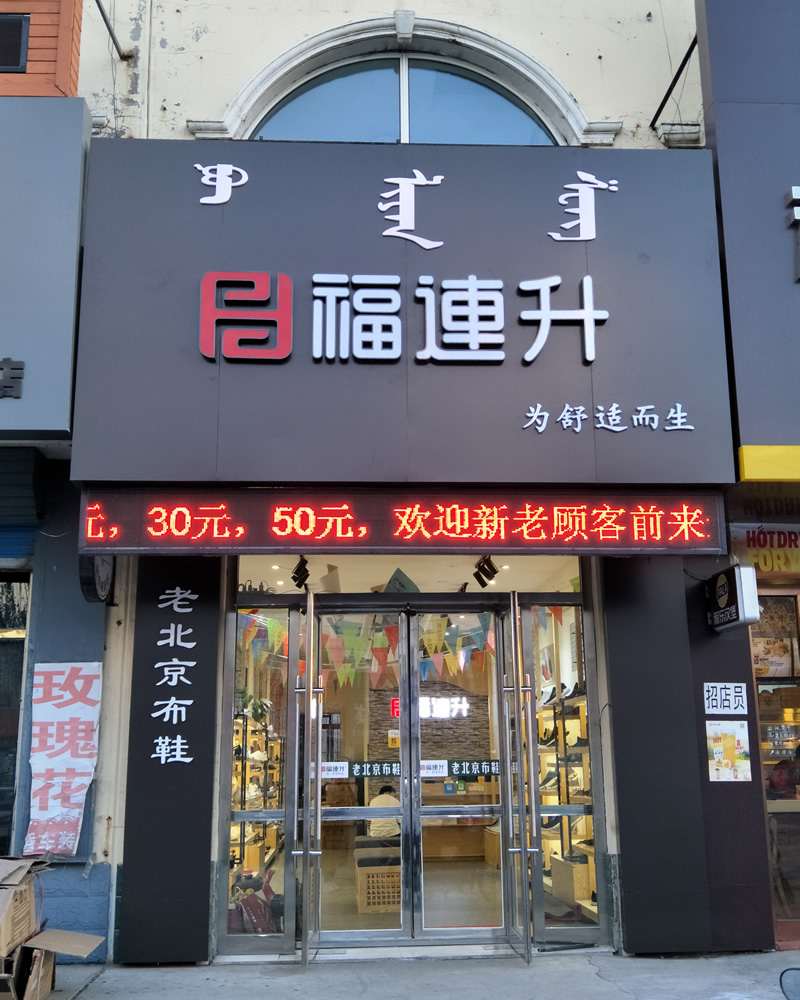 在此,福連升健康休閑中年鞋(原福連升(原福聯升)老北京布鞋)全體員工祝賀:福連升中年鞋內蒙通遼市科爾沁左翼中旗寶龍山鎮二店開業大吉、生意紅火、財源廣進!誠邀各地有志之士加盟合作,共享輝煌!